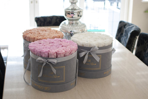 The beautiful fresh roses are cut during their full blossom then the sap is replaced with a moisturiser, this then absorbs moisture from the air which keep the petals nice, fresh and sort for well over the course of the year.
